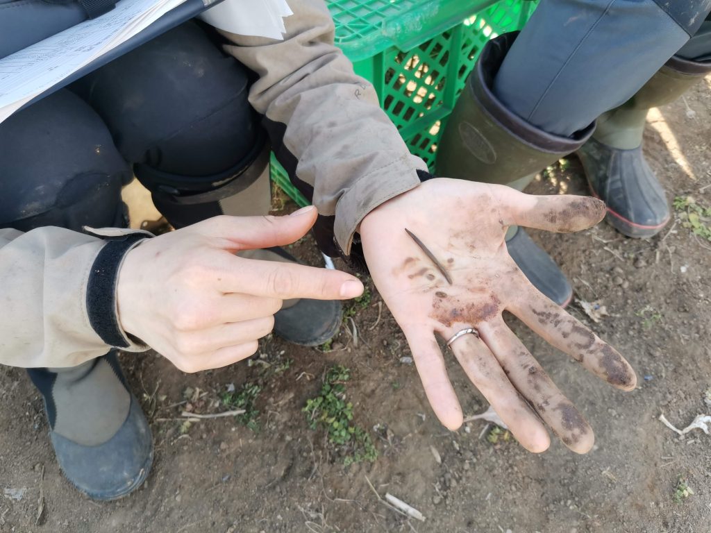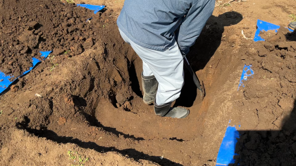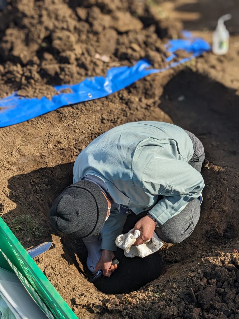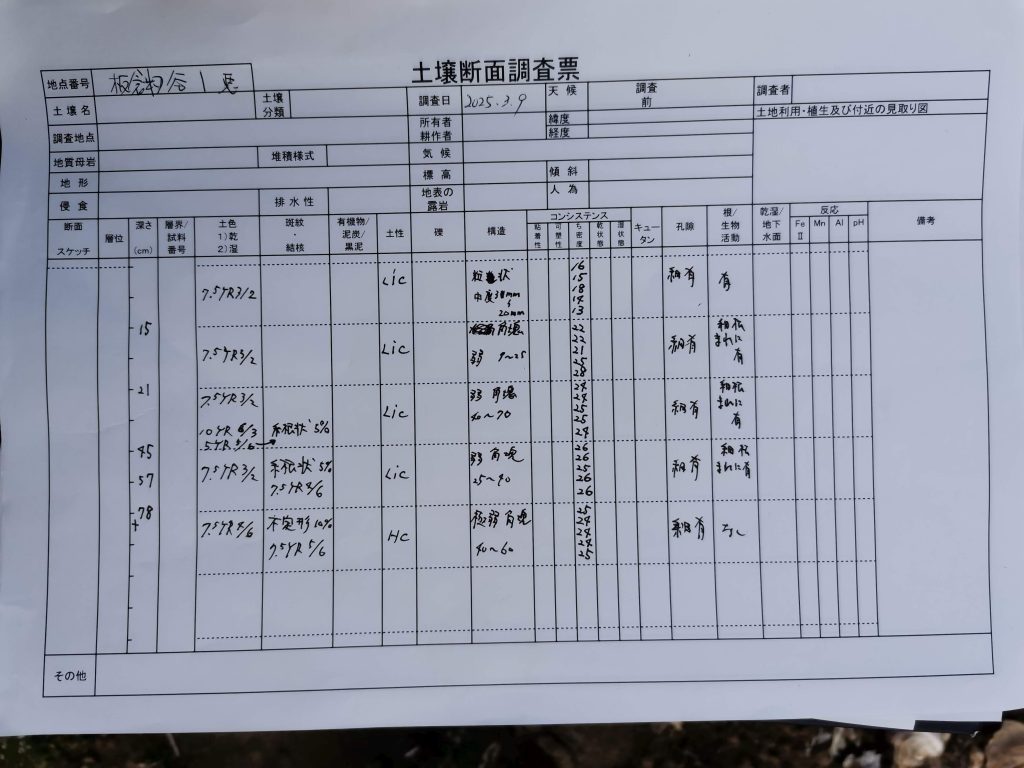 前日には広い範囲で降雪がありましたが、当日は天候にも恵まれ35名の方が参加され、土壌断面調査の穴掘りや土壌断面調査票の記入、改善のためのディスカッションと考察について手法を学び、貫入式土壌硬度計を使った計測や土質の調査なども行いました。