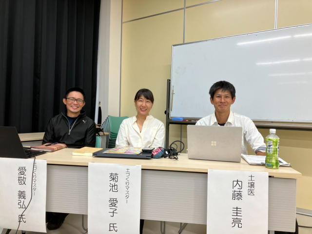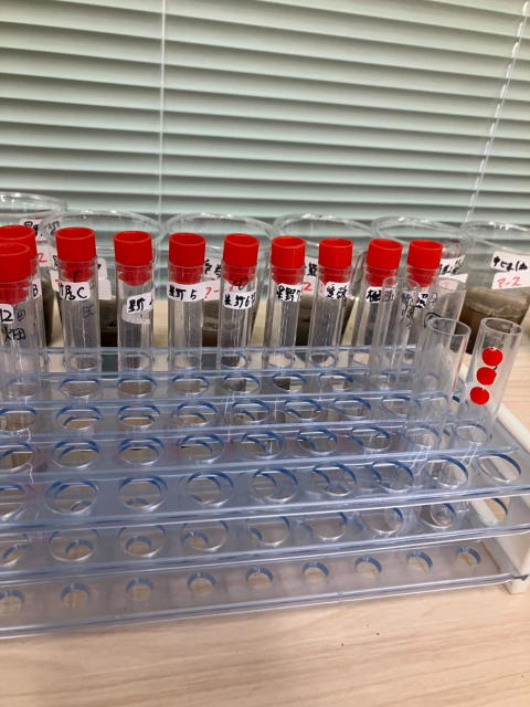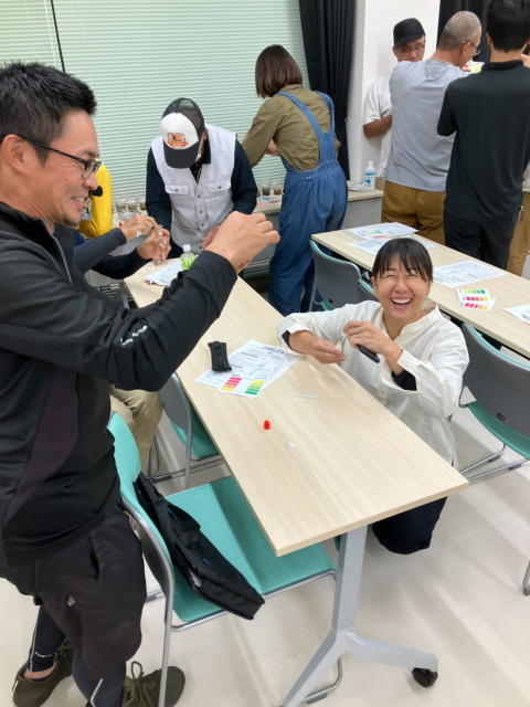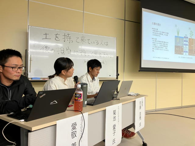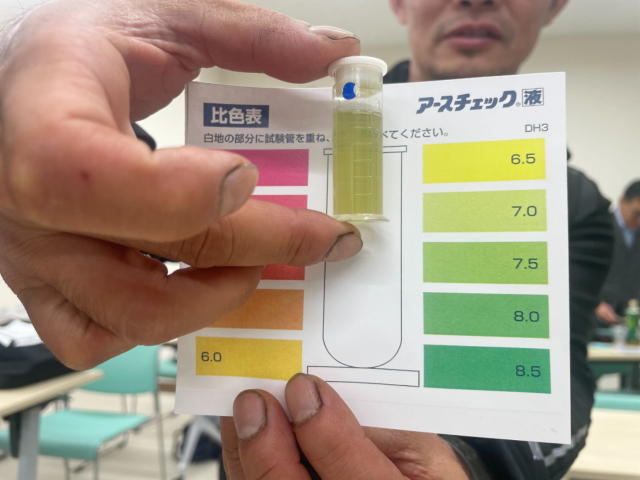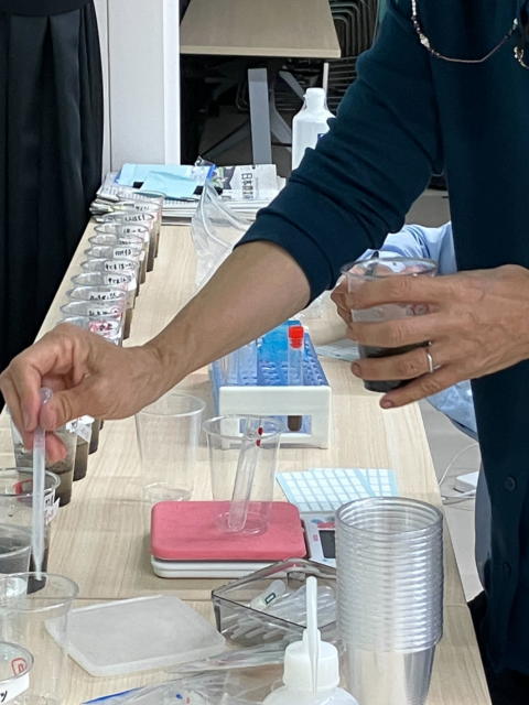 第二部の土壌簡易分析の実習では、参加者の皆様にお持ち頂いた土壌のpHとECの測定を実施し、遠心分離機やアースチェックにも興味津々で取り組んでいました。また分析結果について、真剣に相談されていました。